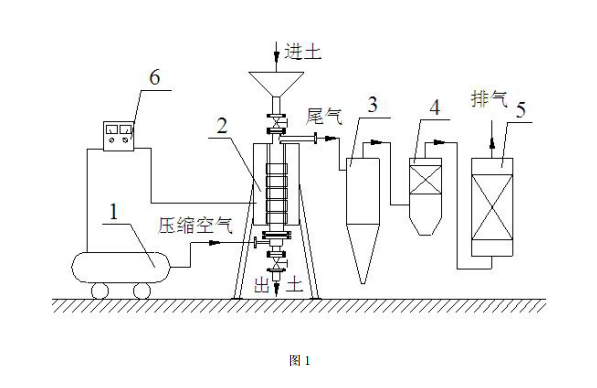 土壤热解吸系统由空气压缩机 1 和立式解吸炉 2 组成。空气压缩机采用上海捷豹压缩 机制造有限公司生产的 V-0.12/8 型空气压缩机,转速 1160 转 / 分钟,容积流量 0.12 立方 米 / 分钟,额定排气压力 0.8MPa,功率 1.1kW。立式解吸炉 2 结构示意图见图 2。立式解吸 炉 2 为圆筒状设备,由不锈钢材料制作。筒体 2 - 3 内径 100mm,高 600mm,厚 20mm ;电加热 元件采用铸铝加热圈,筒外壁设有 1 套铸铝加热圈 2 - 6,功率 3kW ;加热圈 2 - 6 外设置硅 酸铝棉保温层,厚 100mm。打开进料阀门 2 - 2,经破碎处理后污染土壤由进料斗 2 - 1 进 入筒体 2 - 3,铸铝加热圈 2 - 6 间接加热土壤至所需温度,污染土壤中挥发性 / 半挥发性 有机物挥发出来 ;开启压缩机 1,调节空气流量,压缩空气由进气管 2 - 8 经布风装置 2 - 7 进入立式解吸炉 2,与炉内土壤混合接触,挥发出来的有机物在压缩空气的作用下经由排气 管 2 - 4 快速流出立式解吸炉 2 进入尾气处理系统 ;进一步提高压缩空气量,使土壤颗粒在 气流作用下流化起来,确保污染土壤充分混合,受热均匀,提高大颗粒土壤中有机物的挥发 效率,而小颗粒土壤随高速气流进入尾气处理系统被旋风除尘器捕集。加热至所需温度,达 到足够时间后,停止加热,继续通风一段时间后,打开出料管 2 - 10 上的出料阀门 2 - 9, 处理后的土壤排出立式解吸炉 2。立式解吸炉 2 与控制箱相连,土壤加热温度均可自动显 示和自动控制。压缩空气不仅直接携带走从污染土壤中挥发出来的挥发性 / 半挥发性有机 物,而且提高了立式解吸炉内气流的扰动程度,降低了气相传质阻力,提高了污染物的挥发 速率。